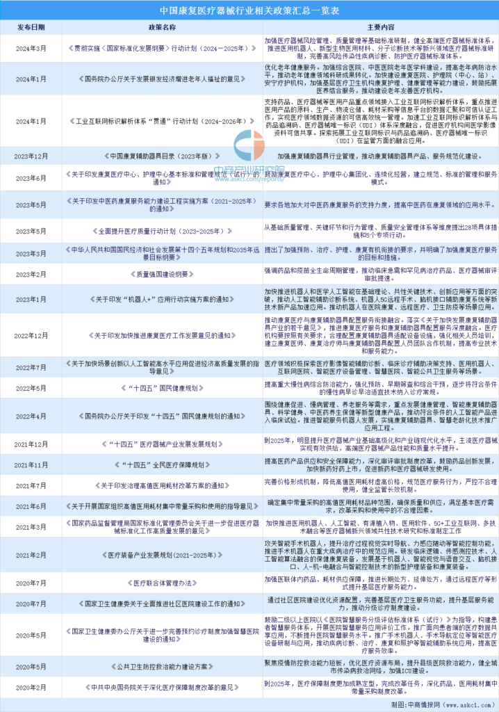 近年来,为了推动康复医疗器械行业的持续发展和创新,国家相继出台了一系列政策举措。这些政策包括《贯彻实施〈国家标准化发展纲要〉行动计划(2024—2025年)》《国务院办公厅关于发展银发经济增进老年人福祉的意见》《中国康复辅助器具目录(2023年版)》《关于印发康复医疗中心、护理中心基本标准和管理规范(试行)的通知》等,对康复医疗器械行业的发展提出了具体的要求和措施。具体政策如下: