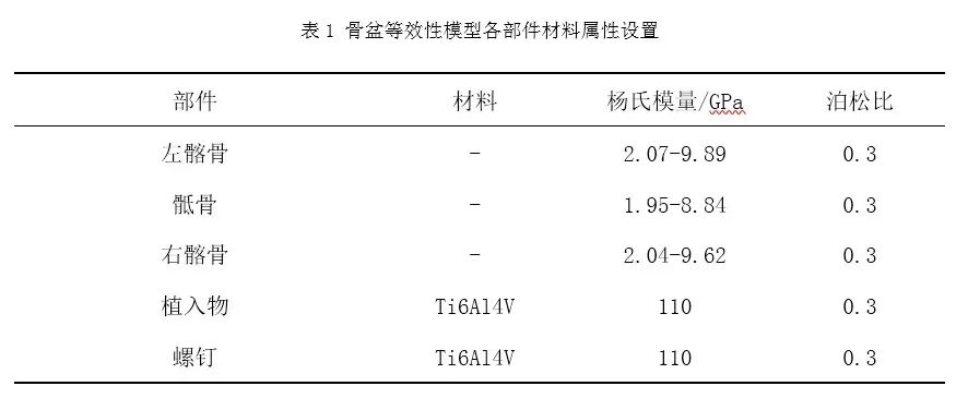 表1列举了骨盆等效性模型中常用到的相关材料及其属性,其中骶骨、左髂骨和右髂骨使用CT图像中灰度值与材料弹性模量的数学关系的方式对其赋予材料属性[5]。