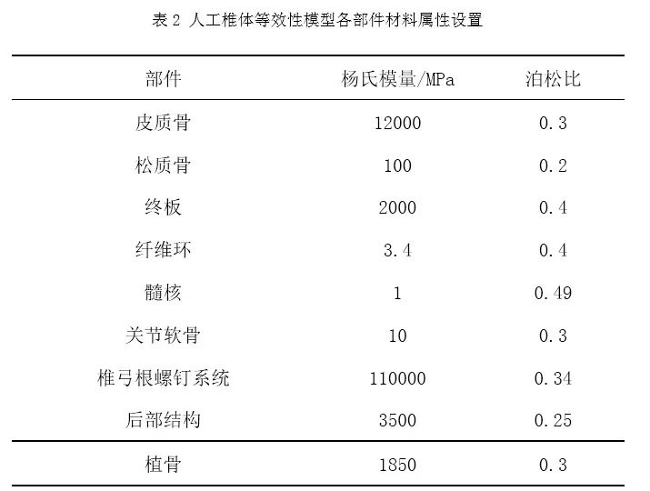 表2列举了人工椎体等效性模型中常用到的相关材料及其属性,其中椎体使用划分皮质骨和松质骨的方式对其赋予材料属性[3,6-10]。